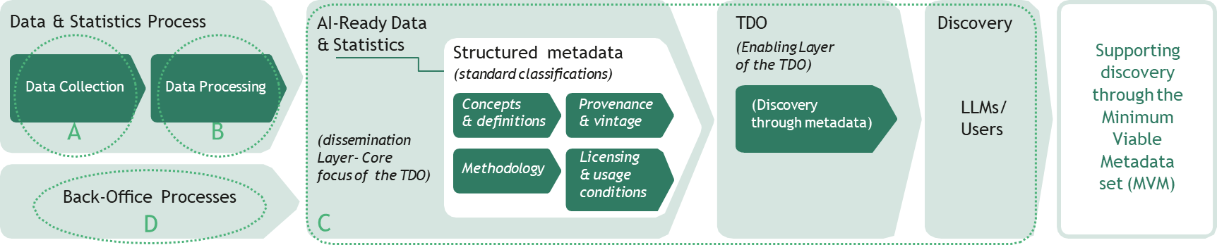 In this context, the TDO focuses specifically on the dissemination layer – strengthening discovery, providing details of access protocols for microdata, AI interfaces, and AI-enabled metadata.
